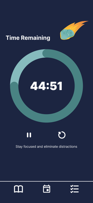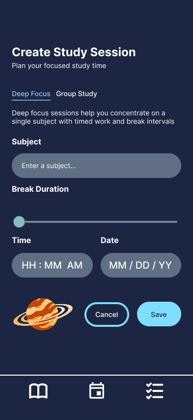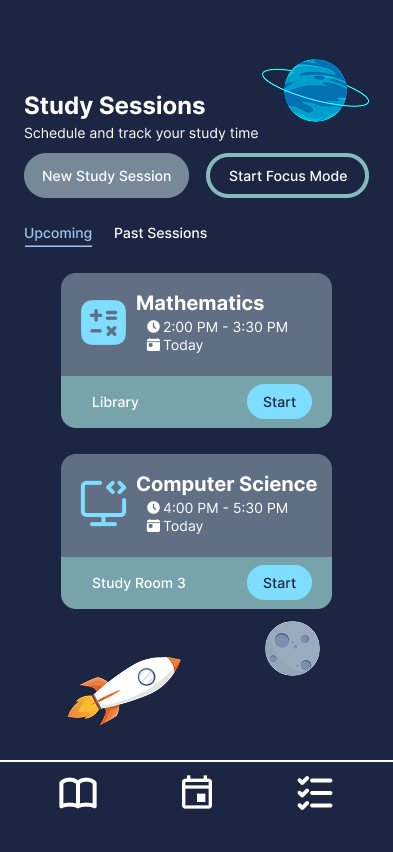 Color and hierarchy were used to guide attention rather than compete for it. The space-themed visual language reinforces a sense of separation from everyday distractions, creating a distinct mode for studying that feels intentional and immersive. Primary actions are emphasized through size and placement, while secondary information remains accessible but unobtrusive.